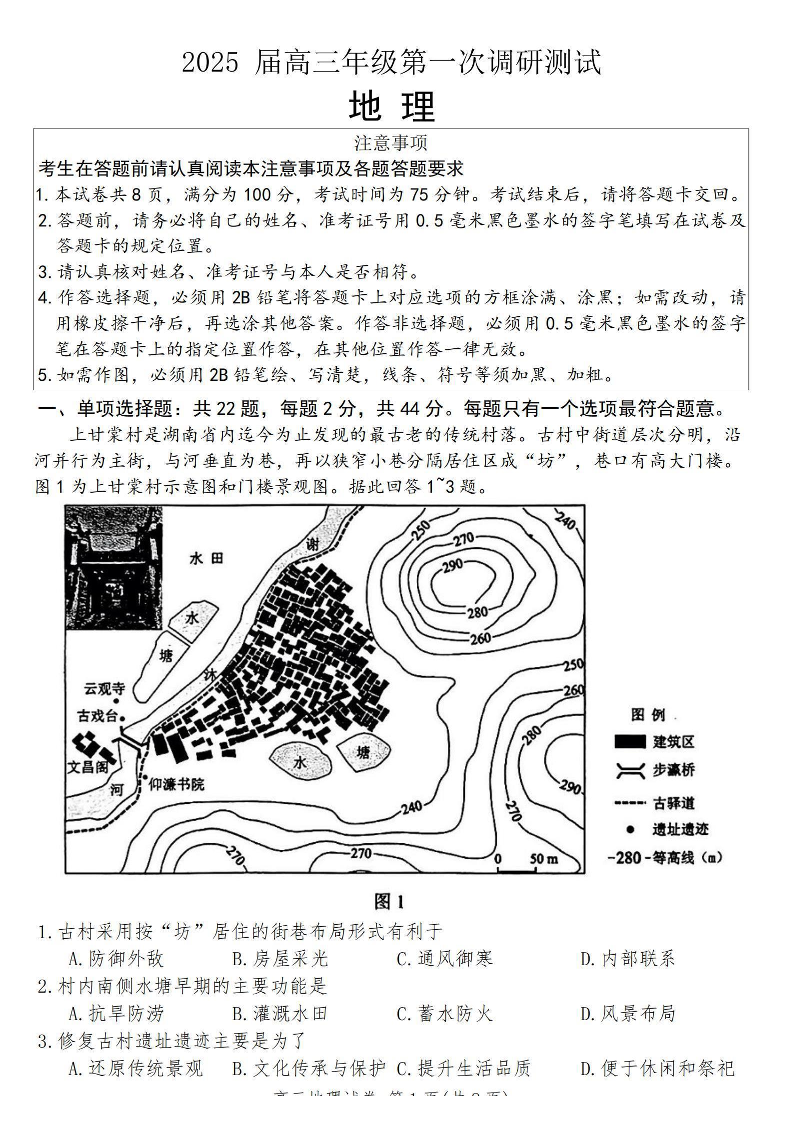 江苏省苏北四市(徐宿淮连) 2025届高三第一次调研测试地理+答案