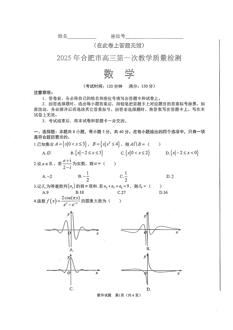 安徽省合肥市2025届高三第一次教学质量检测(一模)数学