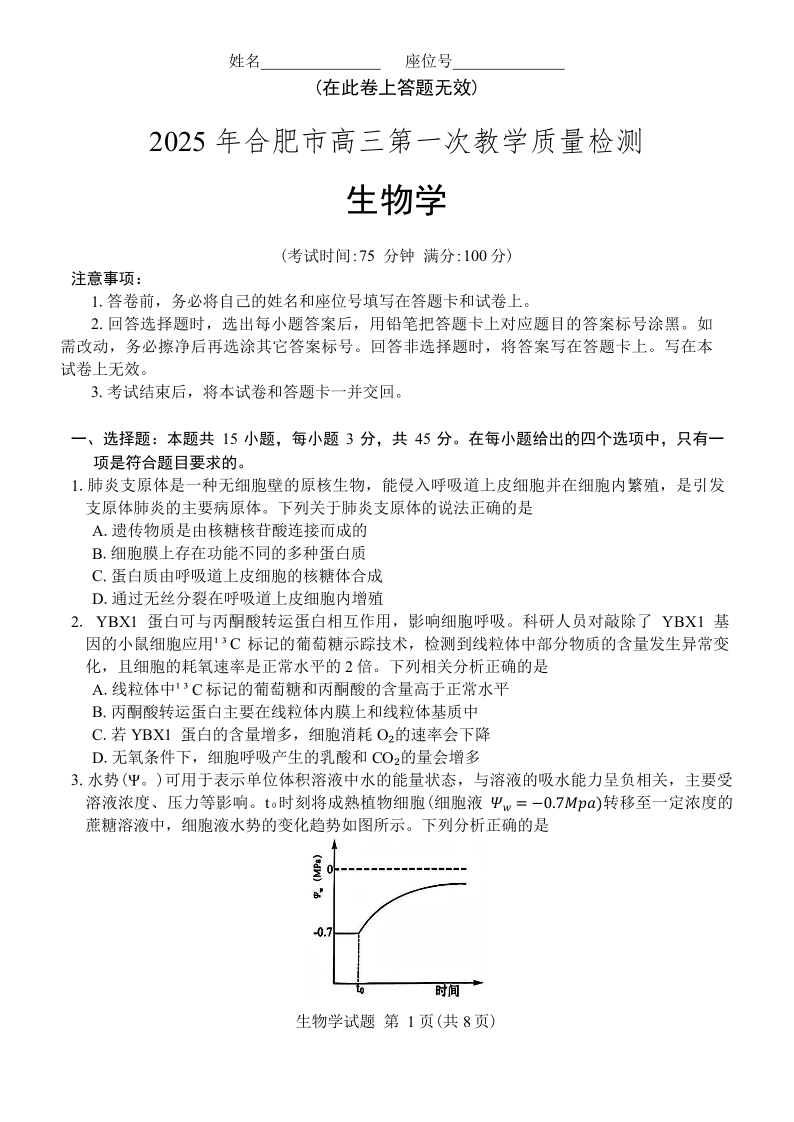 安徽省合肥市2025届高三第一次教学质量检测(一模)生物+答案