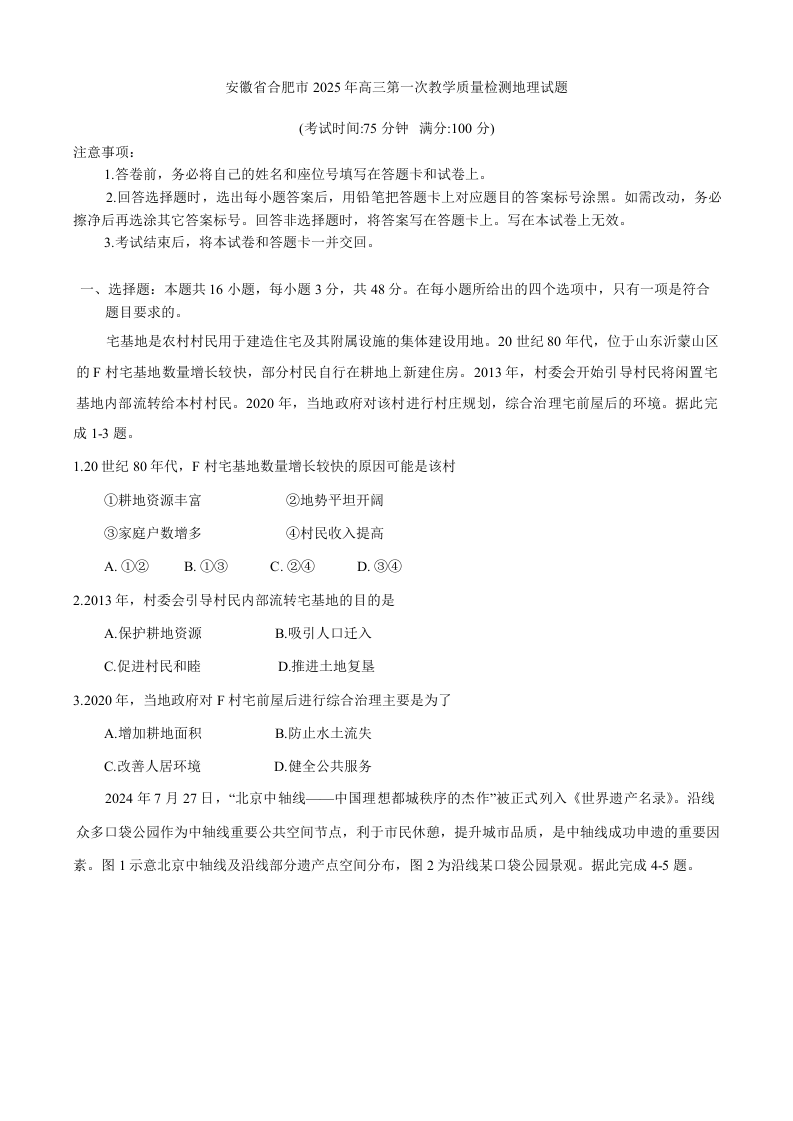 安徽省合肥市2025届高三第一次教学质量检测(一模)地理+答案