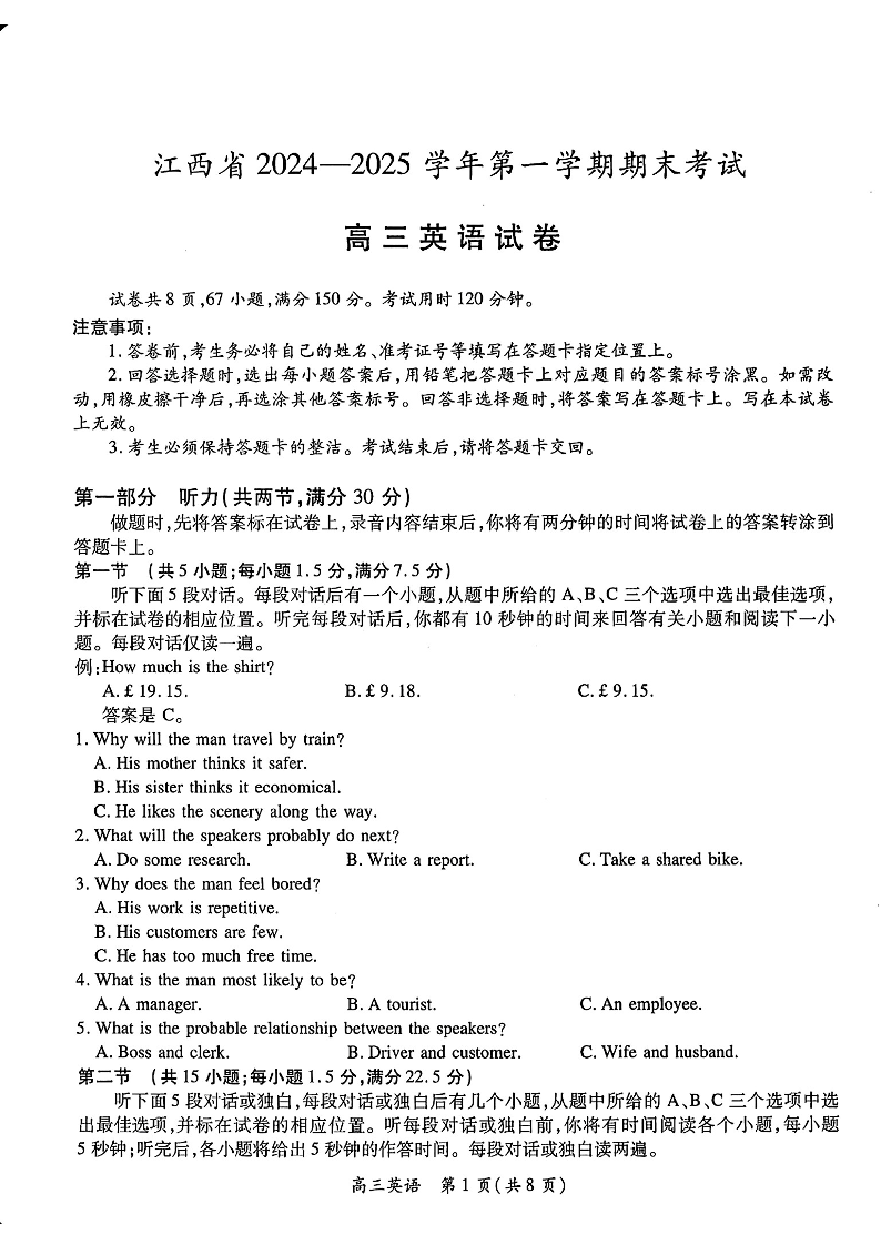 江西省部分高中2025届高三上学期1月期末教学质量检测英语+答案