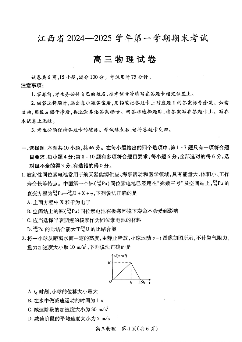 江西省部分高中2025届高三上学期1月期末教学质量检测物理+答案