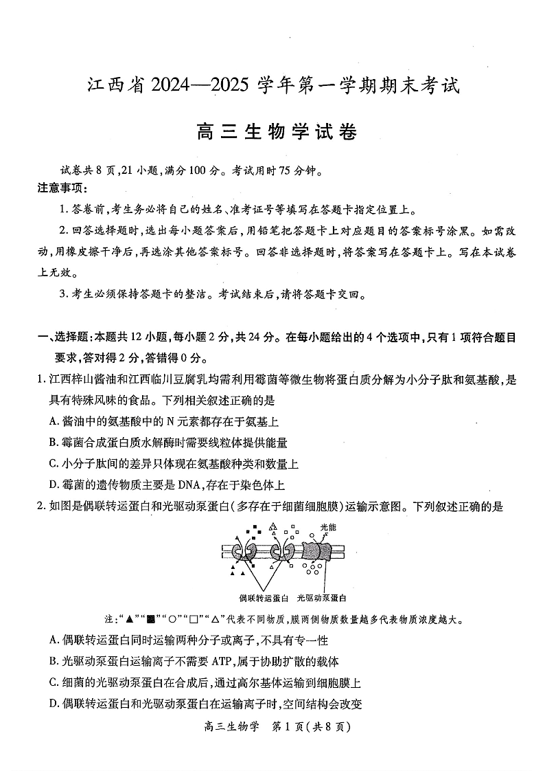 江西省部分高中2025届高三上学期1月期末教学质量检测生物+答案