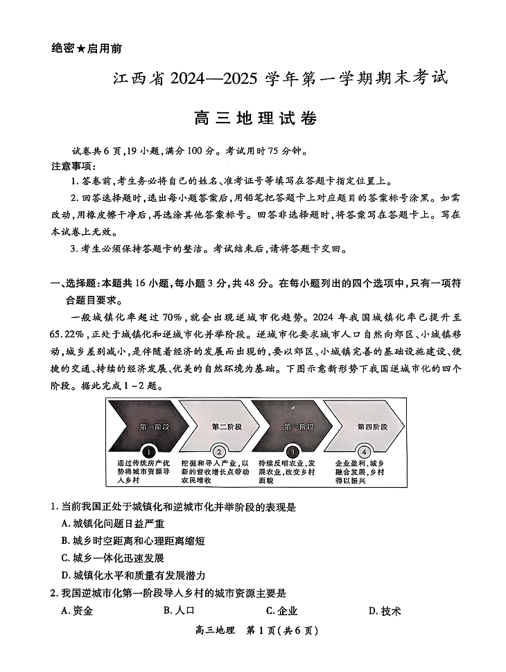 江西省部分高中2025届高三上学期1月期末教学质量检测地理+答案