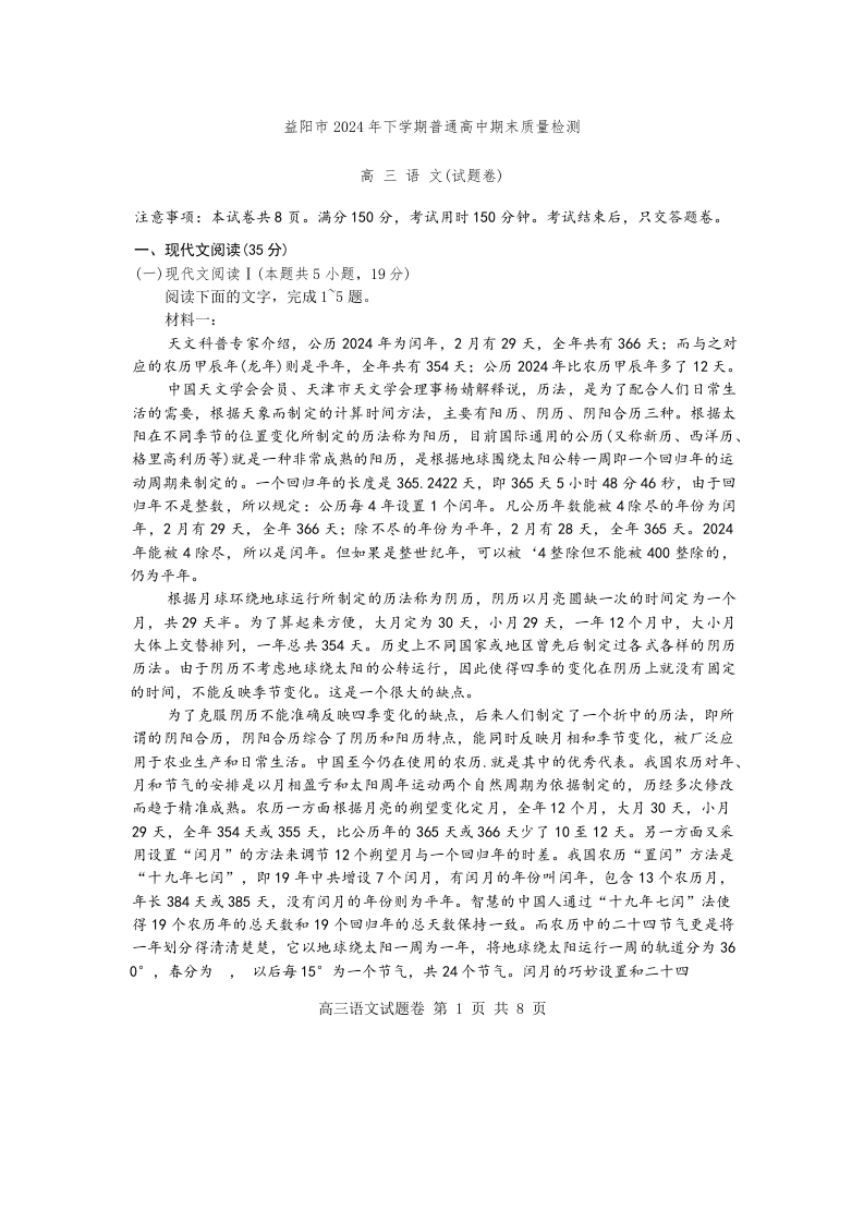 湖南省益阳市2025届高三上学期1月期末考试语文