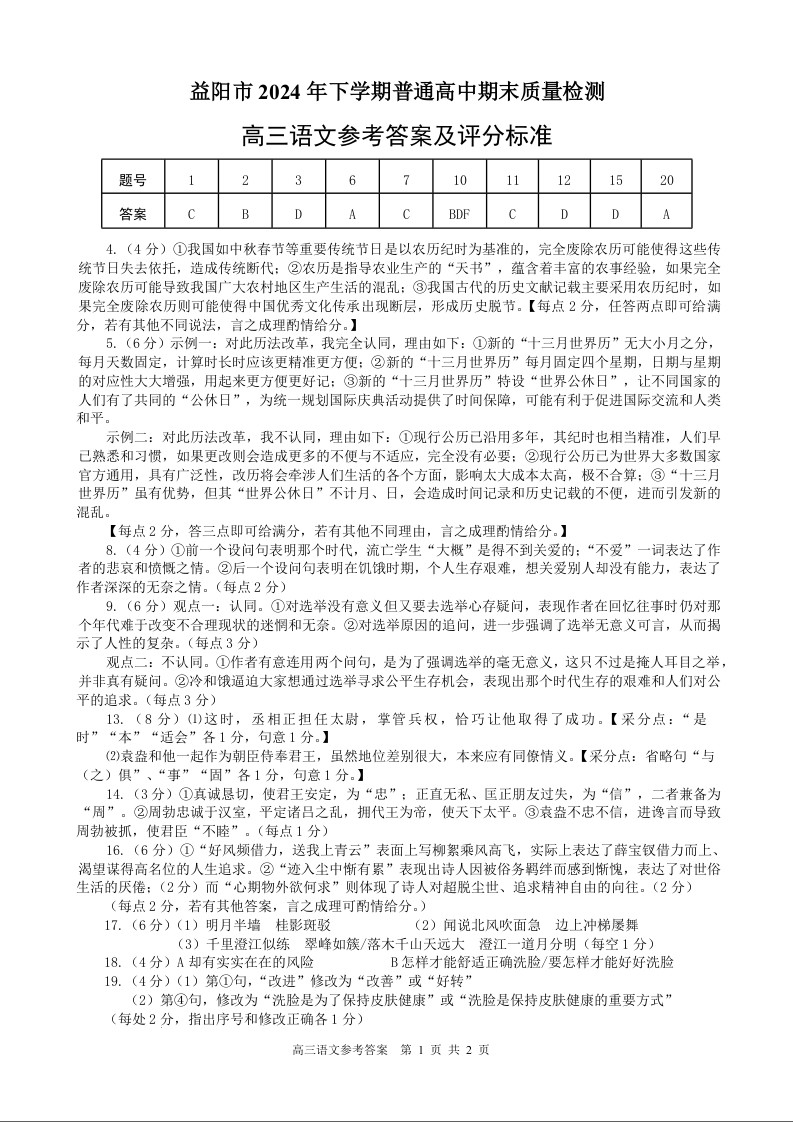 湖南省益阳市2025届高三上学期1月期末考试语文答案