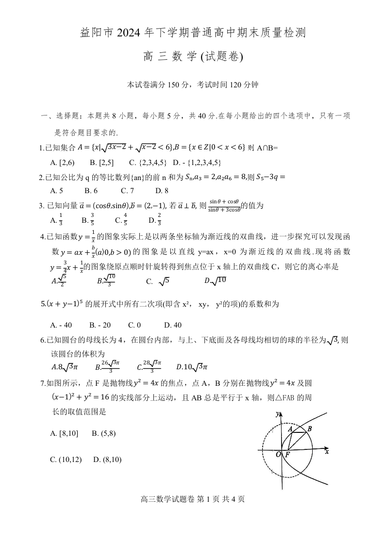 湖南省益阳市2025届高三上学期1月期末考试数学