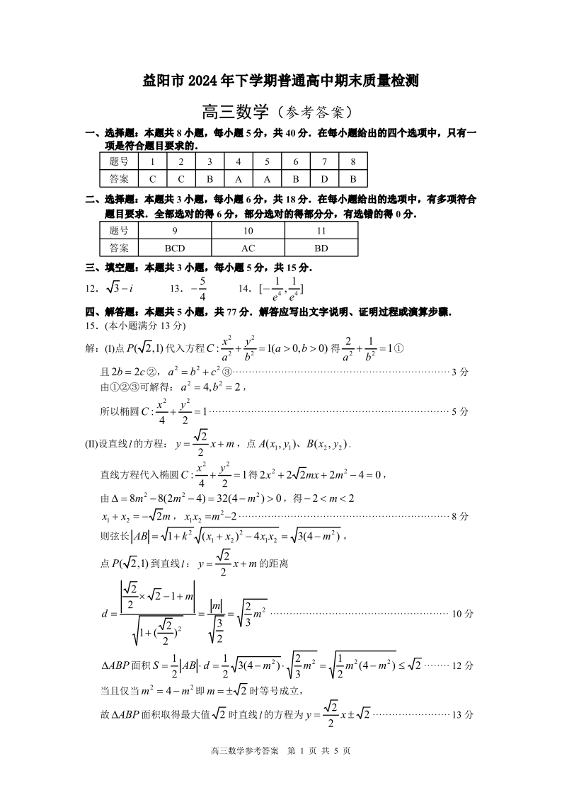 湖南省益阳市2025届高三上学期1月期末考试数学答案