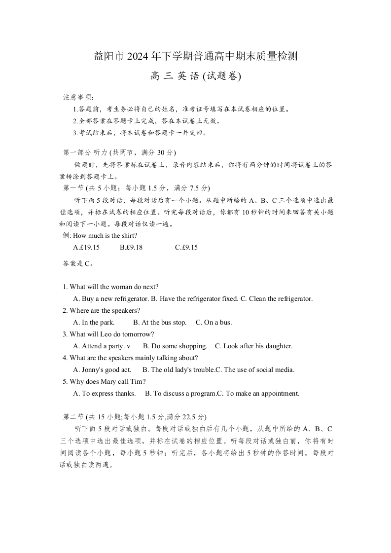 湖南省益阳市2025届高三上学期1月期末考试英语