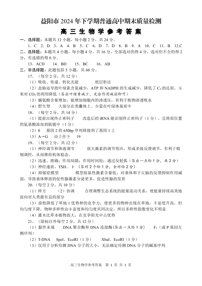 湖南省益阳市2025届高三上学期1月期末考试生物答案