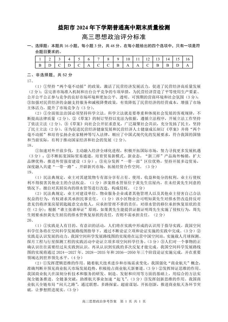 湖南省益阳市2025届高三上学期1月期末考试政治答案