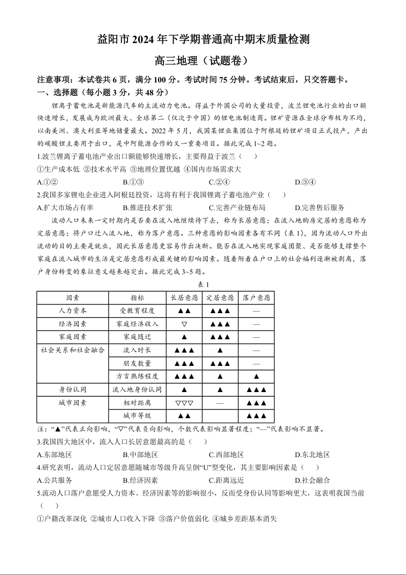 湖南省益阳市2025届高三上学期1月期末考试地理+答案