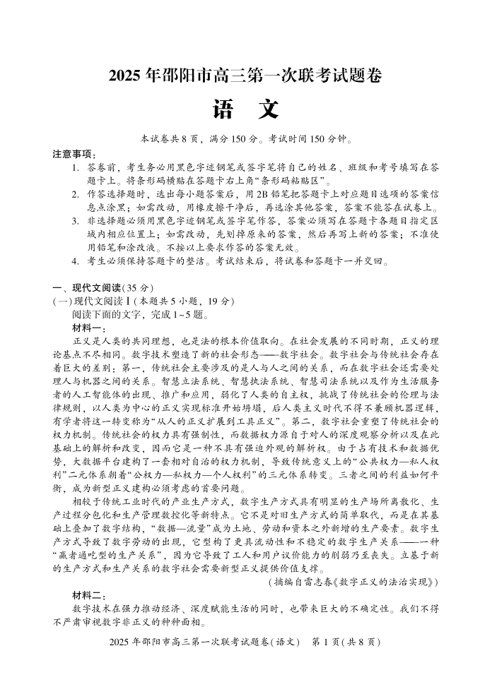 湖南省邵阳市2025届高三上学期第一次联考(一模)语文