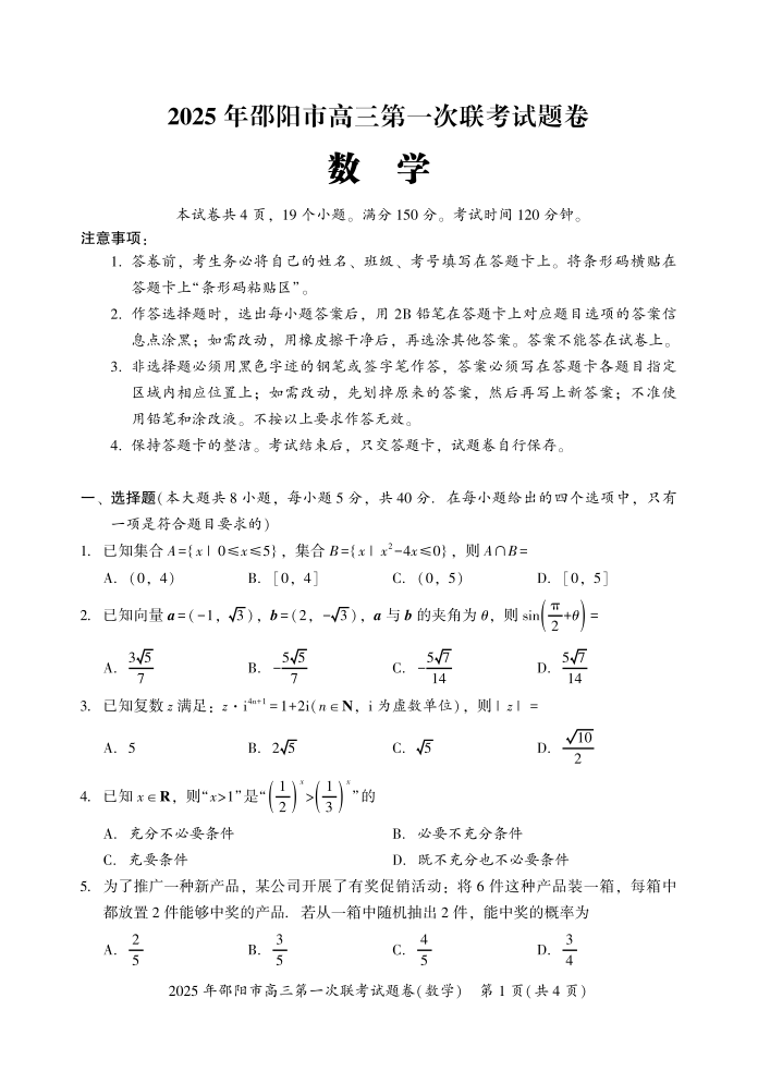 湖南省邵阳市2025届高三上学期第一次联考(一模)数学