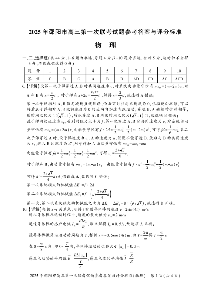 湖南省邵阳市2025届高三上学期第一次联考(一模)物理答案