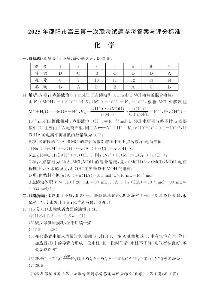 湖南省邵阳市2025届高三上学期第一次联考(一模)化学答案