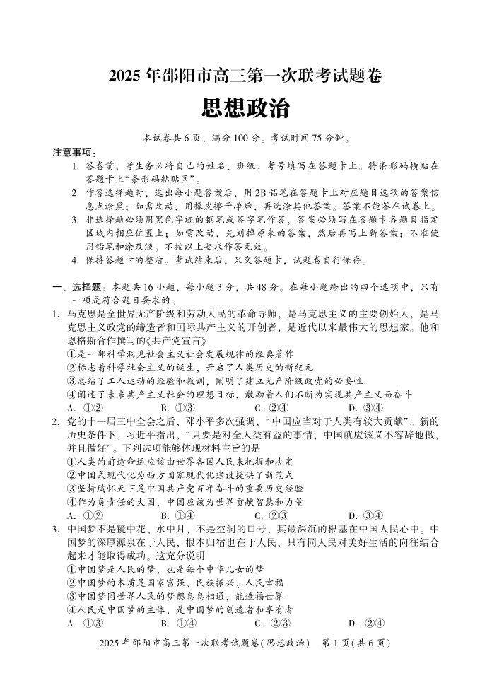 湖南省邵阳市2025届高三上学期第一次联考(一模)政治