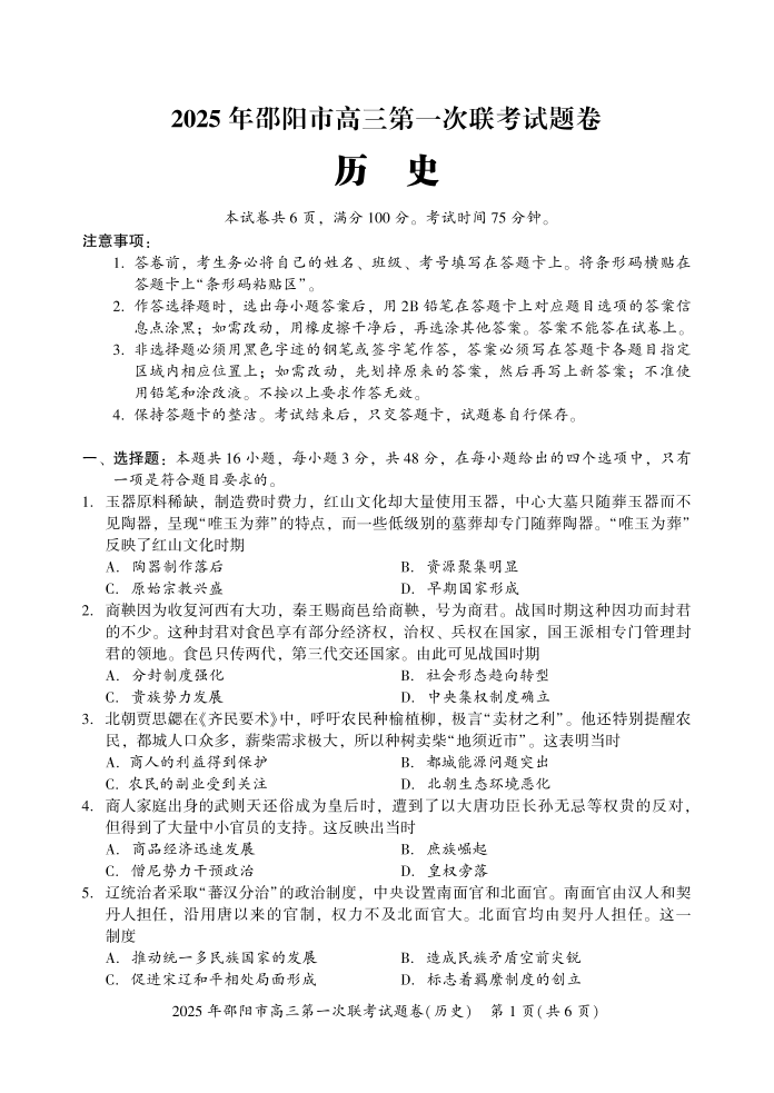 湖南省邵阳市2025届高三上学期第一次联考(一模)历史
