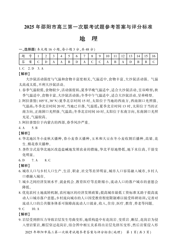 湖南省邵阳市2025届高三上学期第一次联考(一模)地理答案