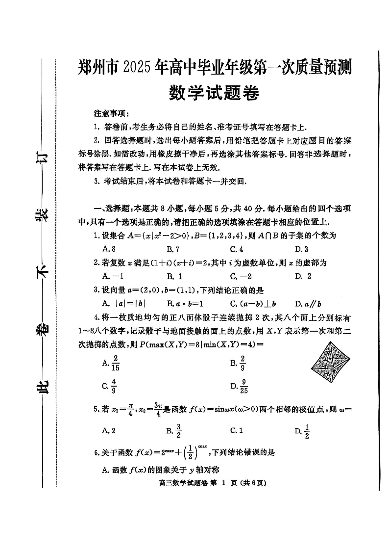 河南省郑州市2025届高三第一次质量预测(一模)数学