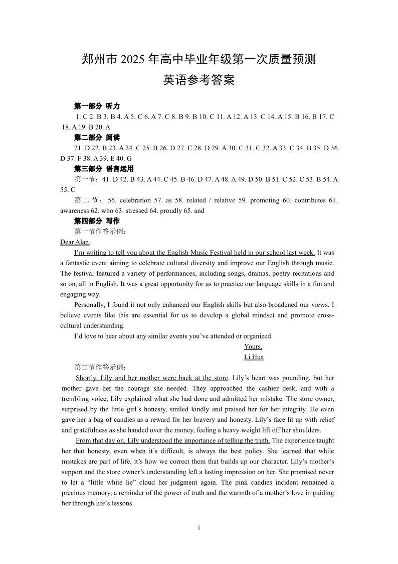 河南省郑州市2025届高三第一次质量预测(一模)英语答案