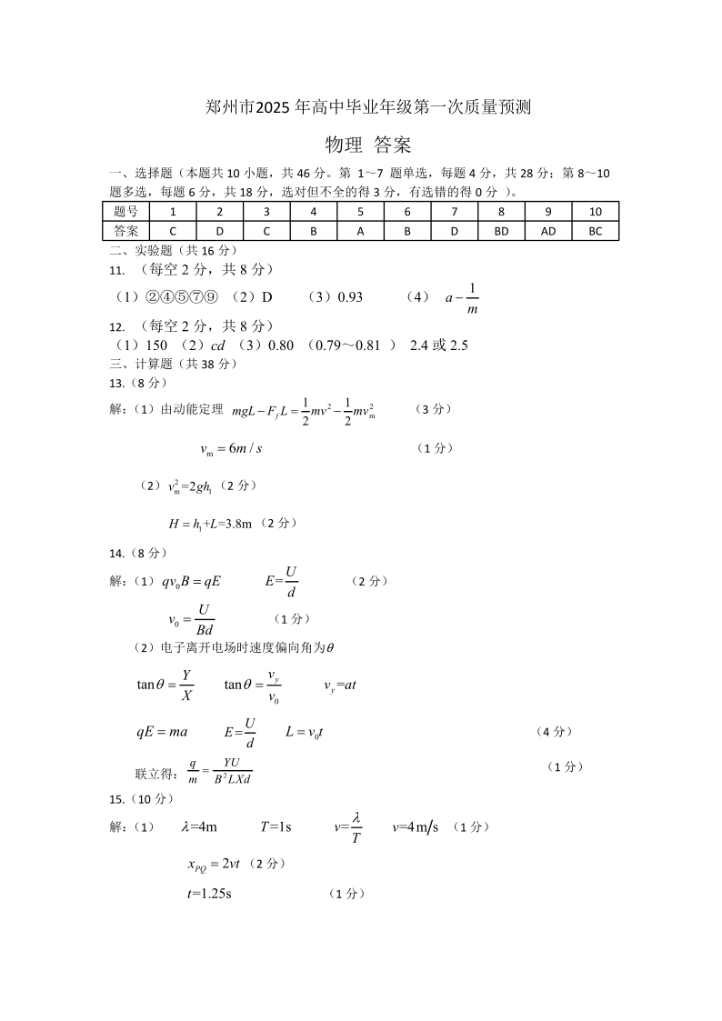 河南省郑州市2025届高三第一次质量预测(一模)物理答案
