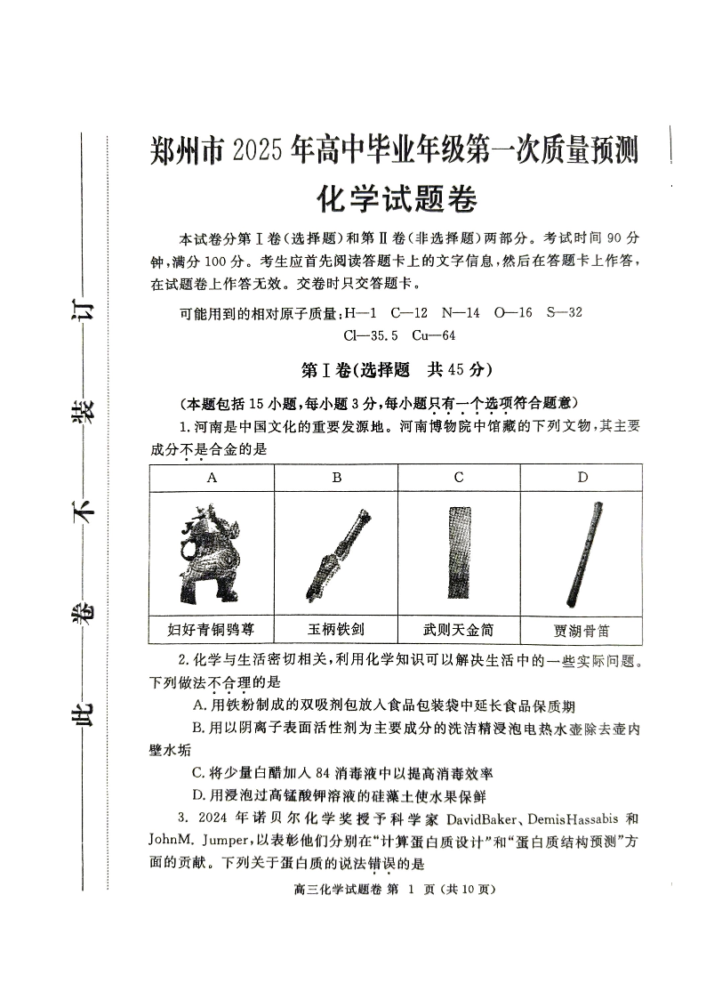 河南省郑州市2025届高三第一次质量预测(一模)化学