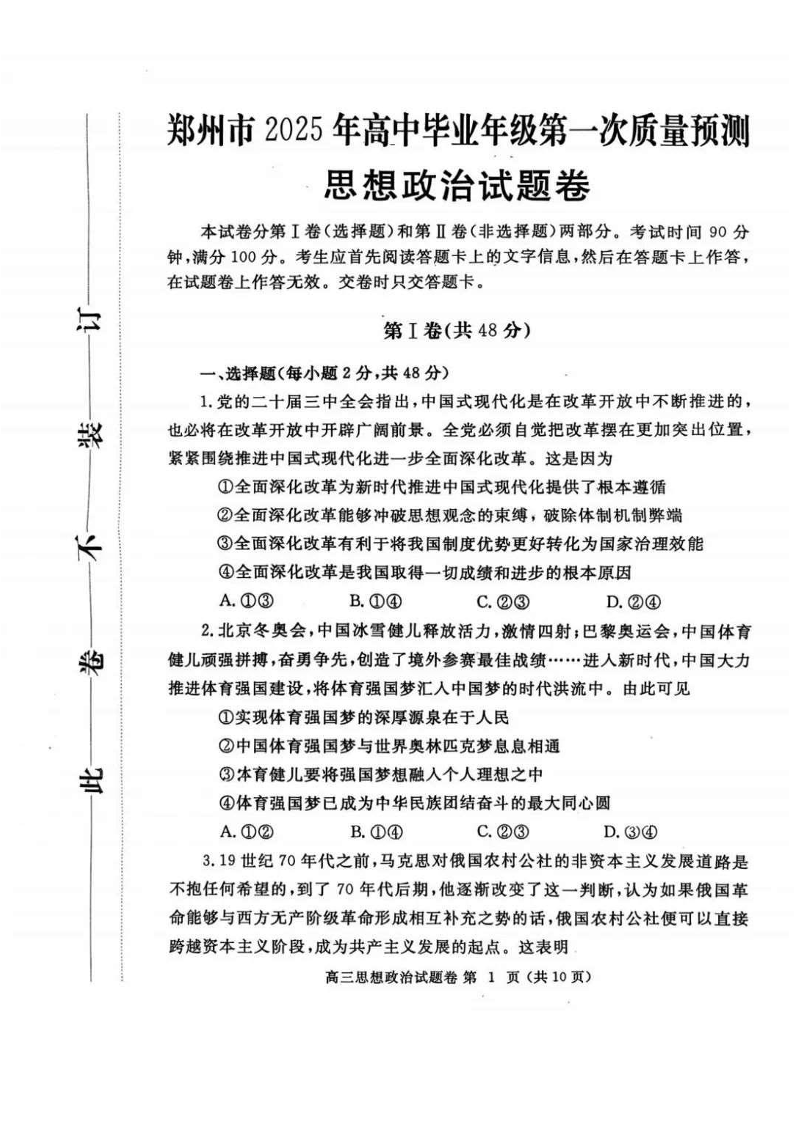 河南省郑州市2025届高三第一次质量预测(一模)政治+答案