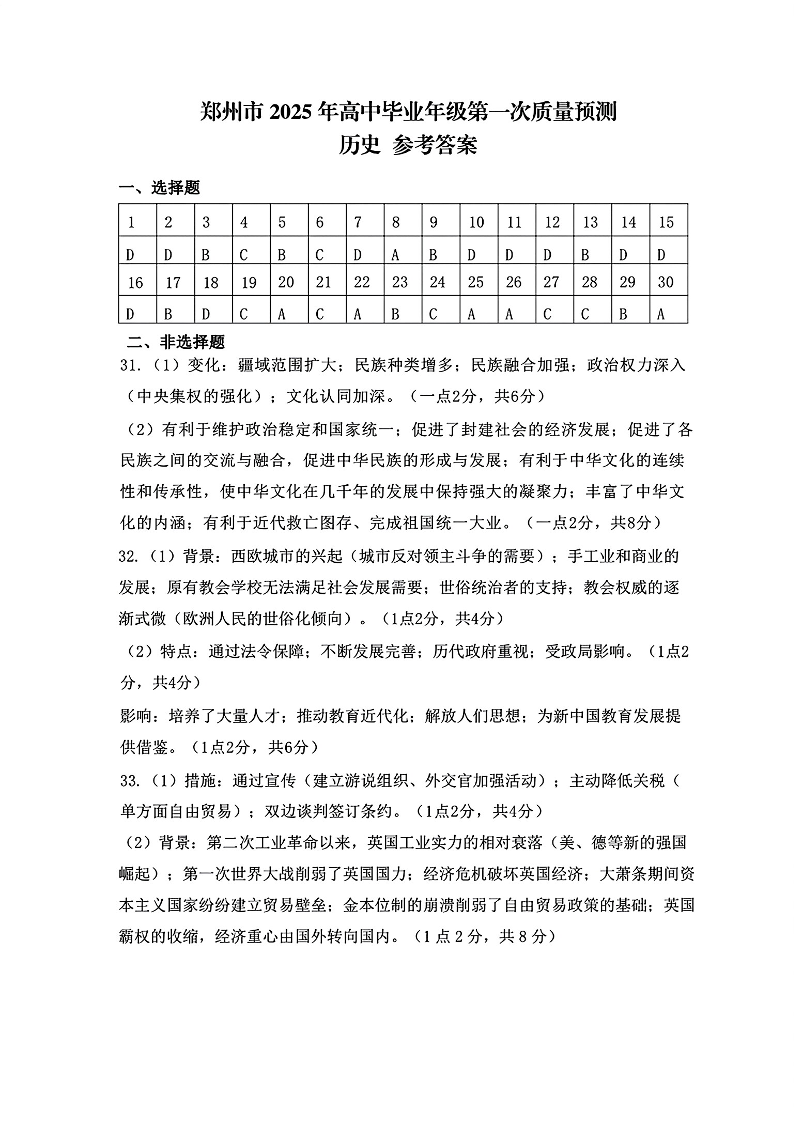 河南省郑州市2025届高三第一次质量预测(一模)历史答案