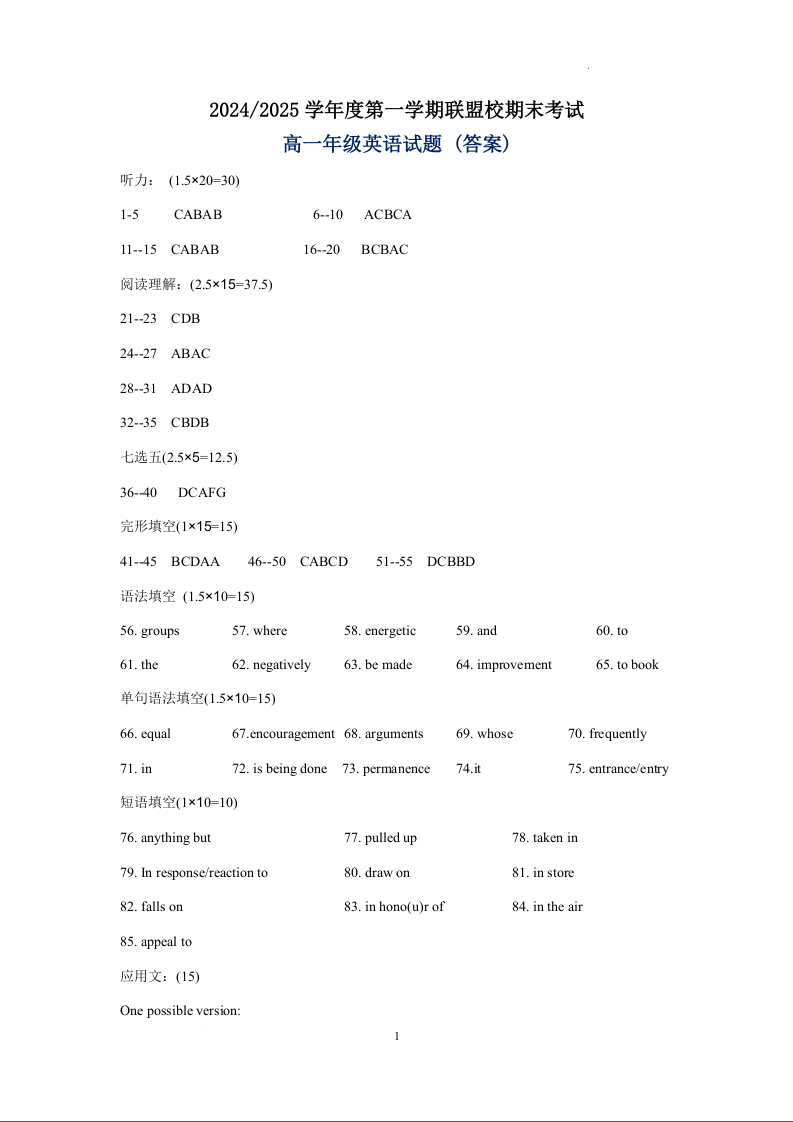 江苏省盐城市五校联盟2024-2025学年上学期1月高一期末考试英语答案