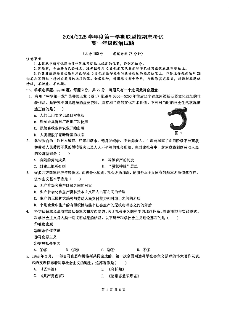 江苏省盐城市五校联盟2024-2025学年上学期1月高一期末考试政治