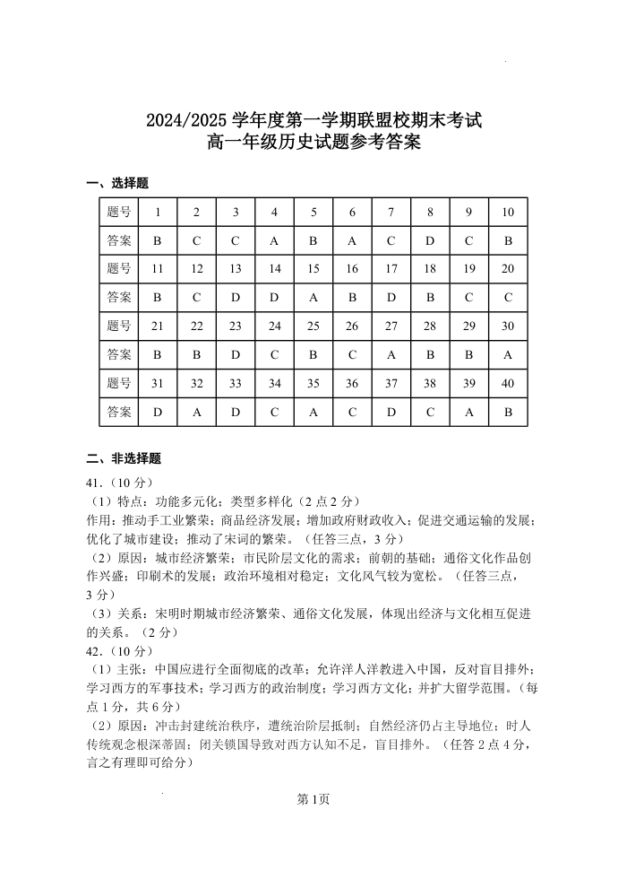 江苏省盐城市五校联盟2024-2025学年上学期1月高一期末考试历史答案