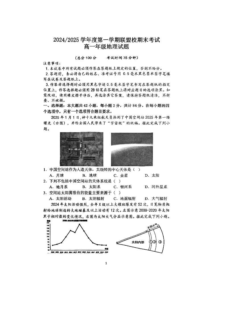 江苏省盐城市五校联盟2024-2025学年上学期1月高一期末考试地理
