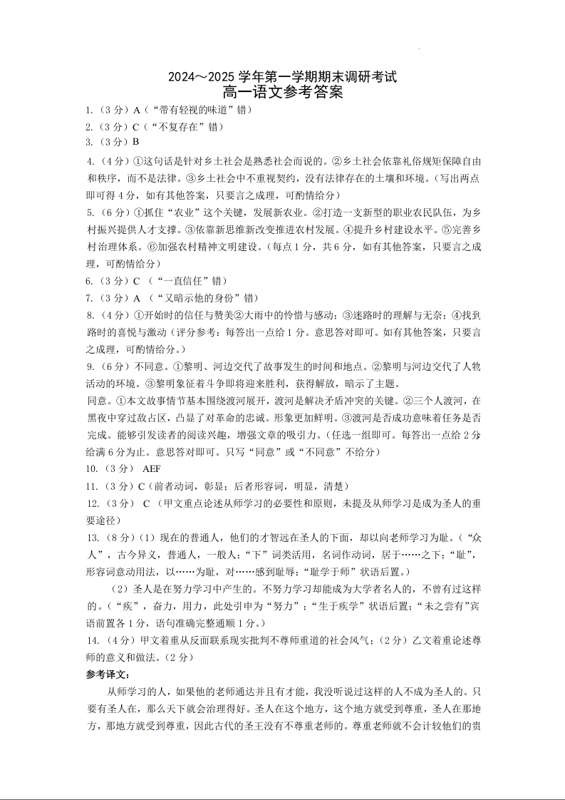 江苏省连云港市2024-2025学年上学期高一期末调研考试语文答案