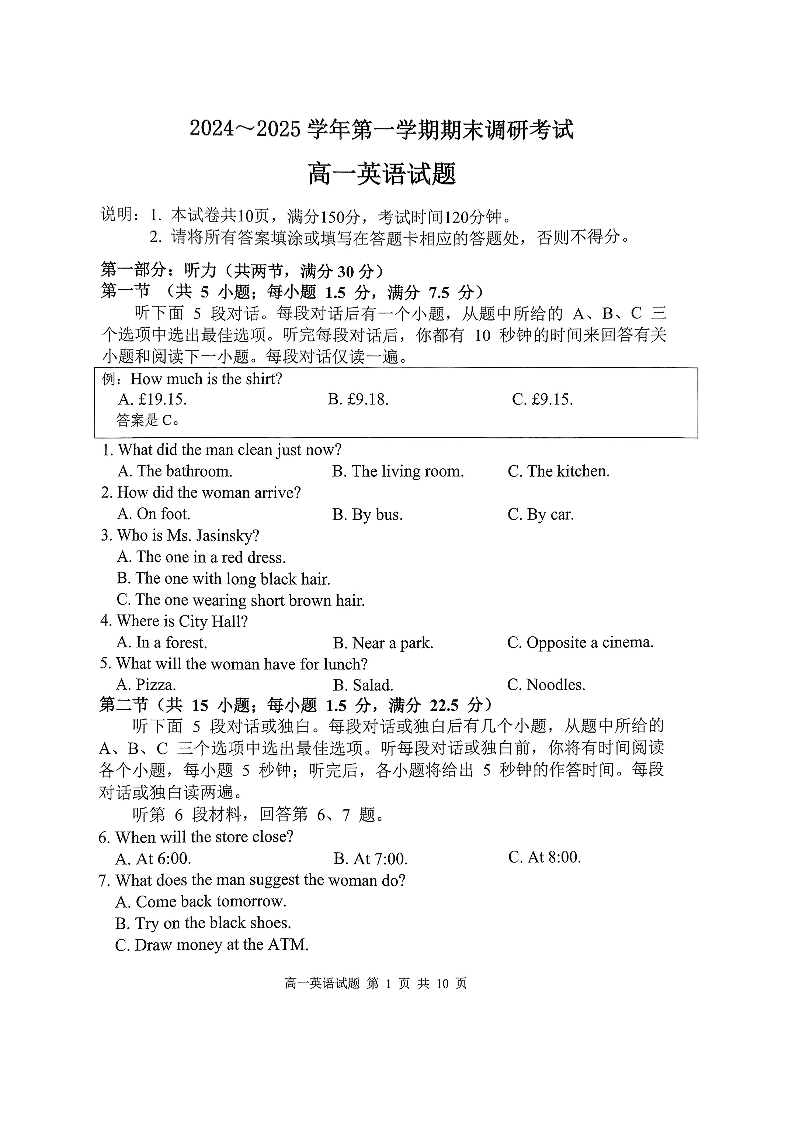 江苏省连云港市2024-2025学年上学期高一期末调研考试英语