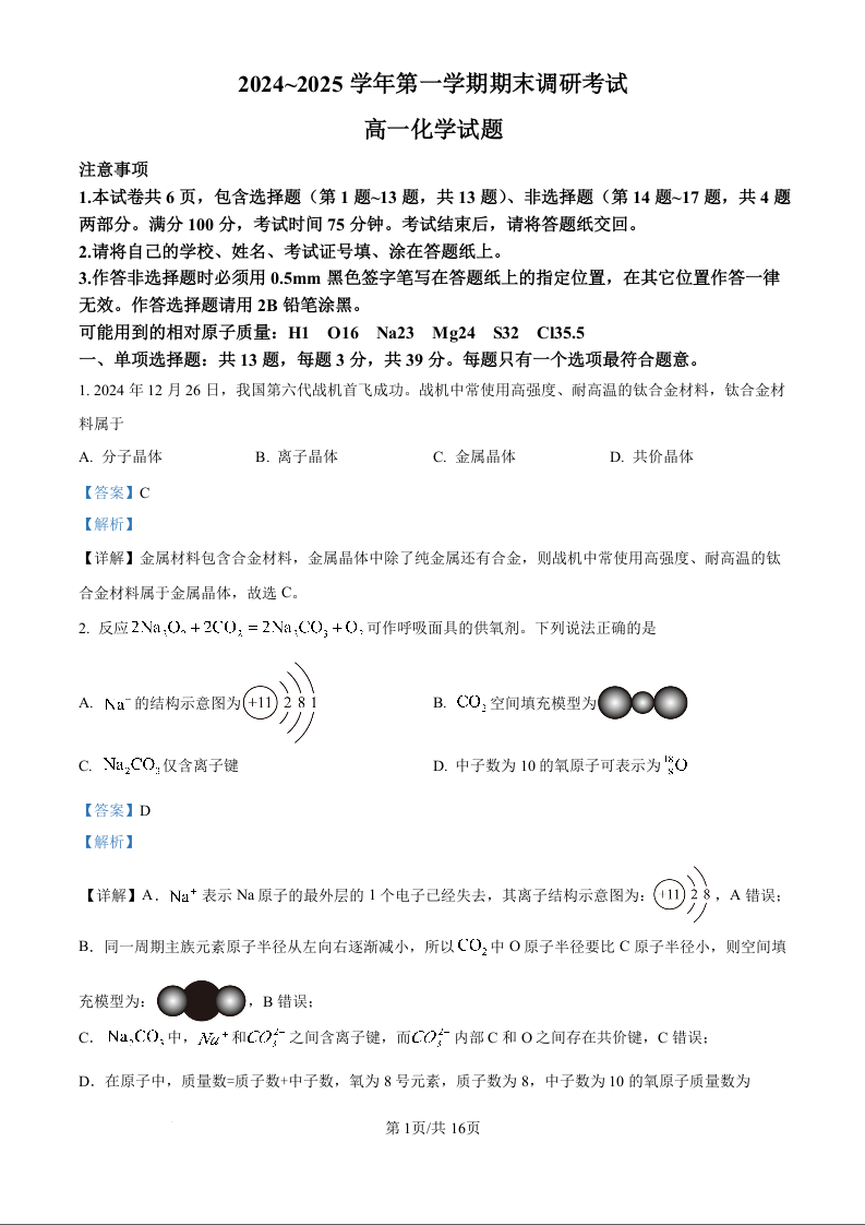 江苏省连云港市2024-2025学年上学期高一期末调研考试化学(精品解析版)