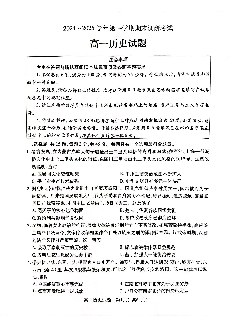 江苏省连云港市2024-2025学年上学期高一期末调研考试历史