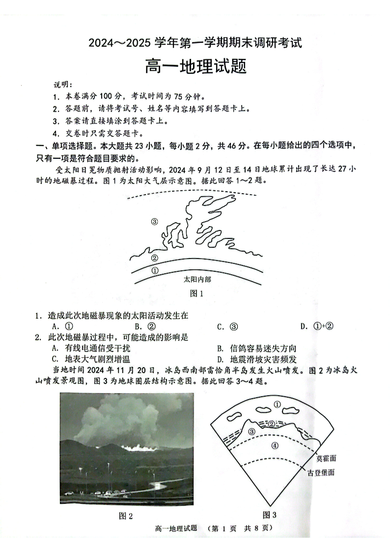 江苏省连云港市2024-2025学年上学期高一期末调研考试地理