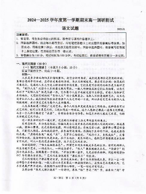 江苏省淮安市2024-2025学年上学期1月高一调研测试语文