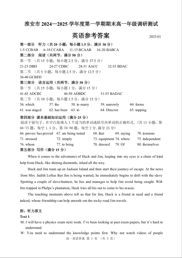 江苏省淮安市2024-2025学年上学期1月高一调研测试英语答案
