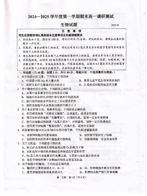 江苏省淮安市2024-2025学年上学期1月高一调研测试生物