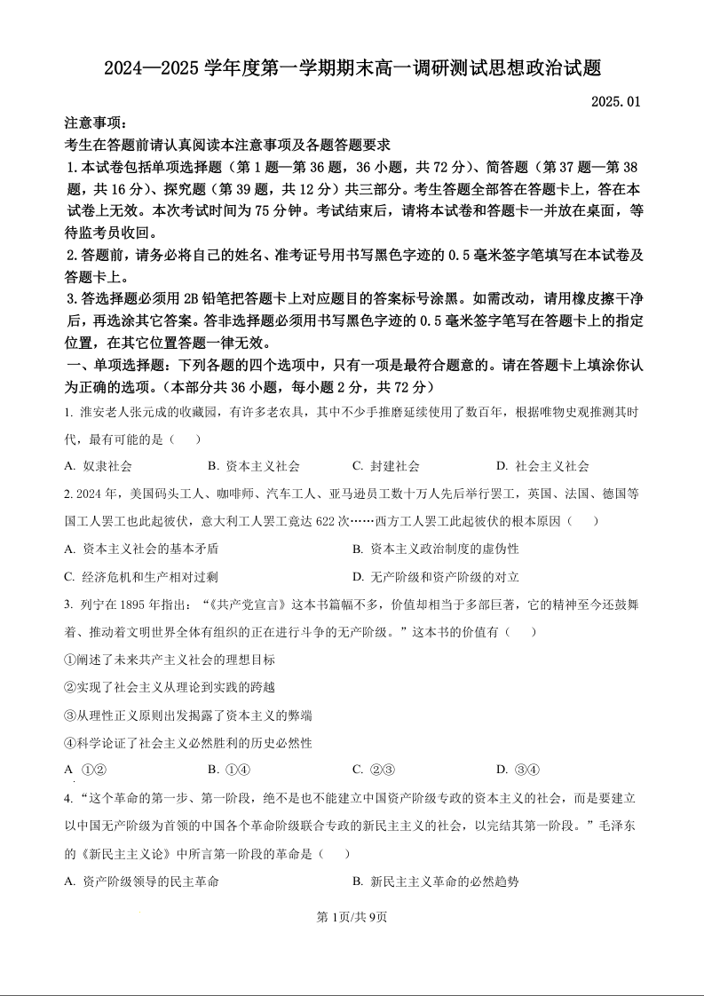 江苏省淮安市2024-2025学年上学期1月高一调研测试政治(原卷版)