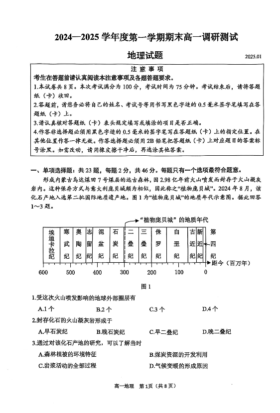 江苏省淮安市2024-2025学年上学期1月高一调研测试地理