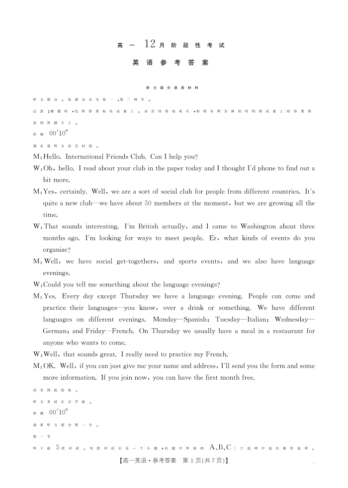 广西省区域高中2024-2025学年上学期12月高一阶段性考试英语答案