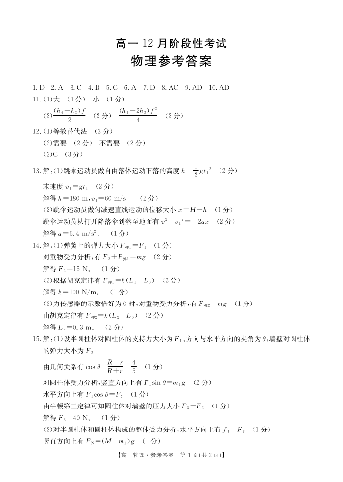 广西省区域高中2024-2025学年上学期12月高一阶段性考试物理答案