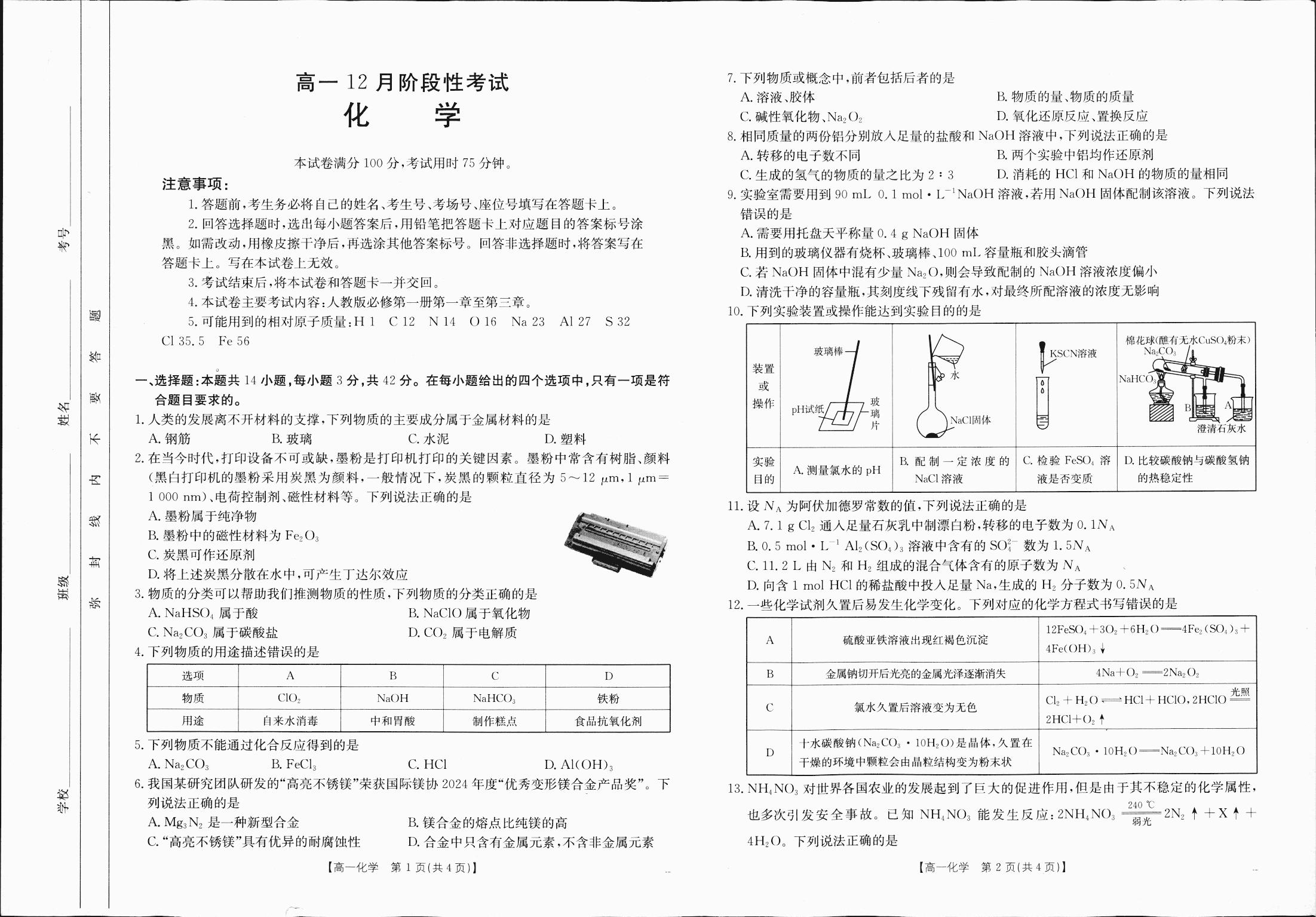 广西省区域高中2024-2025学年上学期12月高一阶段性考试化学