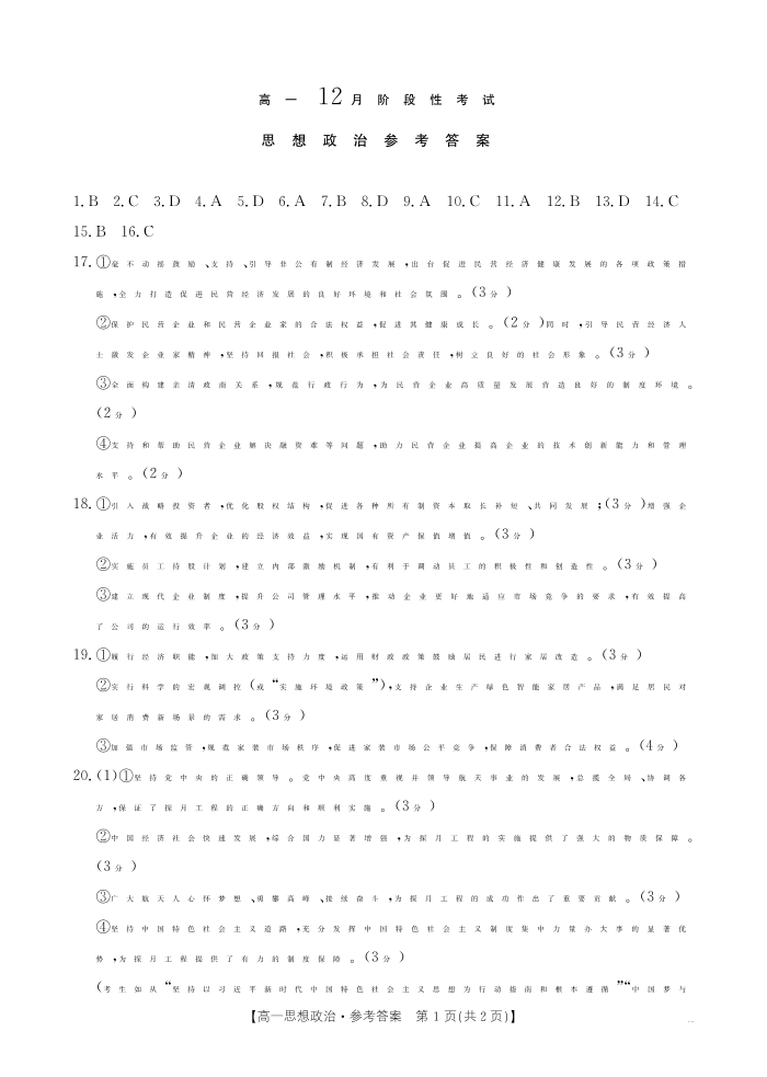 广西省区域高中2024-2025学年上学期12月高一阶段性考试政治答案