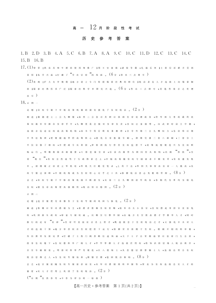 广西省区域高中2024-2025学年上学期12月高一阶段性考试历史答案