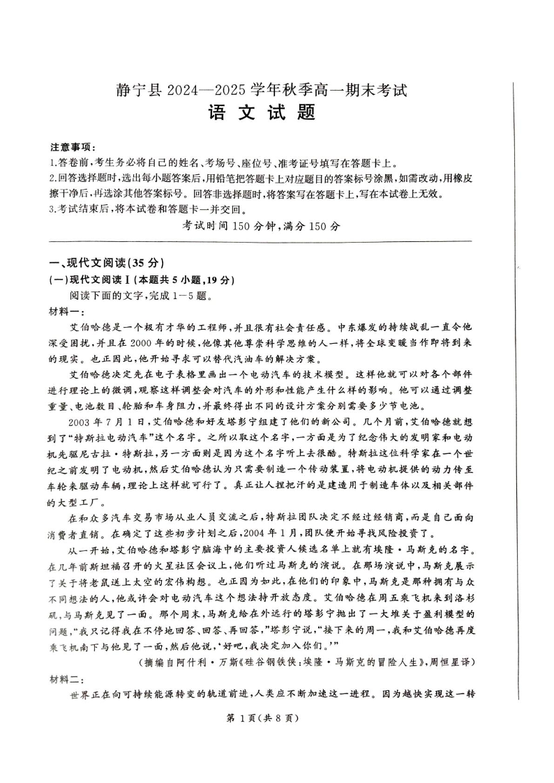 甘肃省平凉市静宁县2024-2025学年上学期1月高一期末考试语文