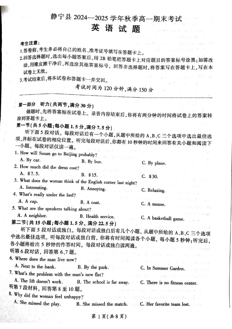 甘肃省平凉市静宁县2024-2025学年上学期1月高一期末考试英语+答案